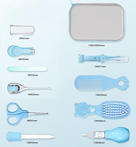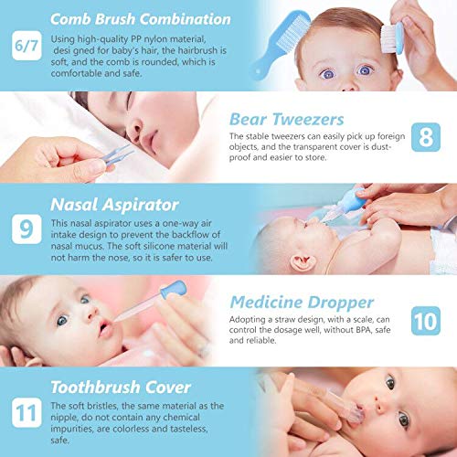 - 👶【UPGRADED 11-PIECE SET】Our baby grooming kit includes nail clippers, rounded safety scissors, glass nail file, nasal suction, baby brush, baby comb, baby feeder dropper, digital tester, tweezers, finger toothbrush, Earwax spoon LED light. Fully meet the baby’s daily needs!