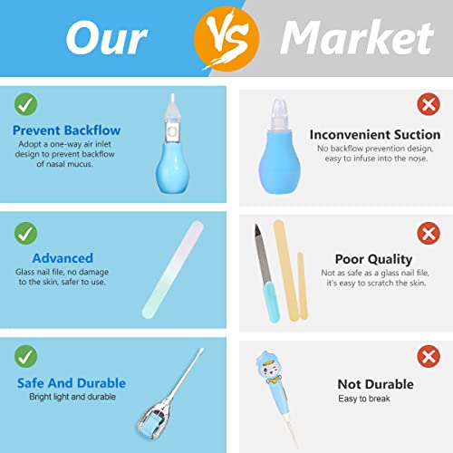 - 👶【HIGH-QUALITY PRODUCTS】Our baby grooming kit are different from similar products on the market! The baby nasal aspirator adopts anti-reverse flow design, one-way air intake, and safer to use; the glass nail file, made of emery material, is sturdy and durable, rubs the surface delicately and does not hurt the nails; the baby earwax spoon comes with LED light Function, clean more thoroughly!