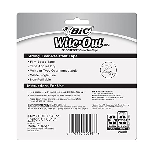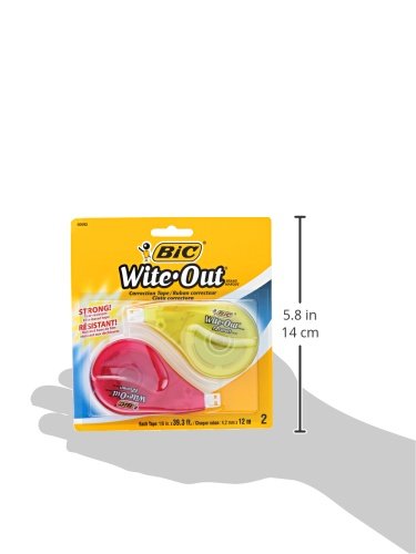 Details: Make fast, easy and precise corrections on even the toughest errors with BIC Wite-Out Brand EZ Correct Correction Tape. This tear-resistant, film-based BIC Wite-Out Brand Correction Tape comes in a tape dispenser that offers maximum comfort and control, so you can easily and accurately correct mistakes. The tear resistance offers tidy, inconspicuous corrections that last. The Wite-Out Brand tape requires no dry time and won’t bleed or drip, so you can instantly write or type your corrections over it. A translucent body lets you see exactly how much BIC correction tape remains and a self-winding wheel lets you easily rewind the correction tape should it become loose. One pack contains 2 tape dispensers, each containing 39.3 feet of white correction tape. If you’re looking for reliable office or school supplies for lefties and righties, look no further than this Wite-Out Brand correction tape. From America’s No. 1 correction brand*, choose BIC Wite-Out Brand EZ Correct Correction Tape for a high-quality, safe and affordable product you can trust. *Source: The NPD Group/Retail Tracking Service and Commercial Tracking Service, U.S., based on actual unit sales; 12ME June 2022 combined.