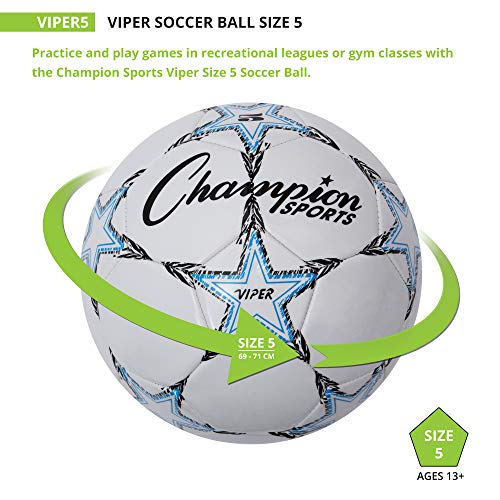 Details: Practice and play games in recreational leagues or gym classes with the Champion Sports Viper Soccer Ball. This size 5 soccer ball is designed with a TPU cover for exceptional softness, making heading, kicking, and blocking the ball easy and safe. Featuring an airlock butyl bladder and machine-stitched panels, this soccer ball is sure to retain its air and shape to hold up to regular use in both indoor and outdoor conditions. Ball ships deflated – pump not included.