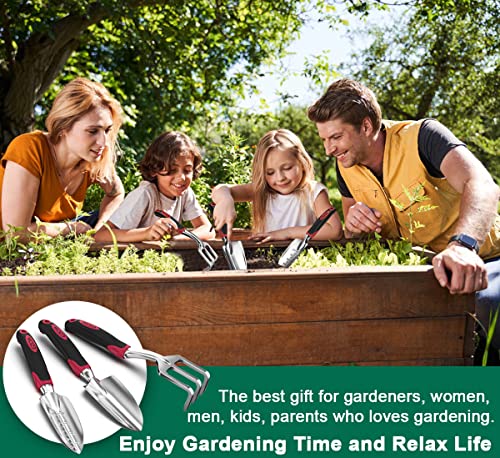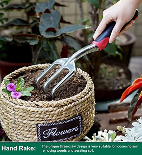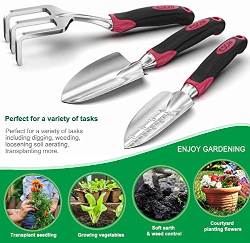 - [COMFORTABLE HANDLES]: Ergonomical and soft-grip handle, which made of High Quality TPR material that reduces the pressure on the wrist and hand. Reduce hand pain and fatigue while digging, weeding, planting and cutting. Also there are suitable for large or small sized hands. More labor saving and more comfortable in long-term grip and use. A hole at the top of each handle for clutter-free storage
