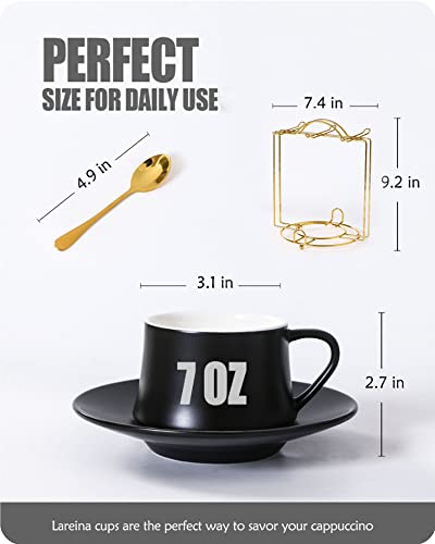 - Cappuccino Cups With Stand: Lareina large cappuccino cup set of 6 is sold with a metal stand to organize the cups and saucers after use. It helps greatly to get rid of the mess in your kitchen and keep it tidy and well-organized way. The stand makes moving the cups safer and easier