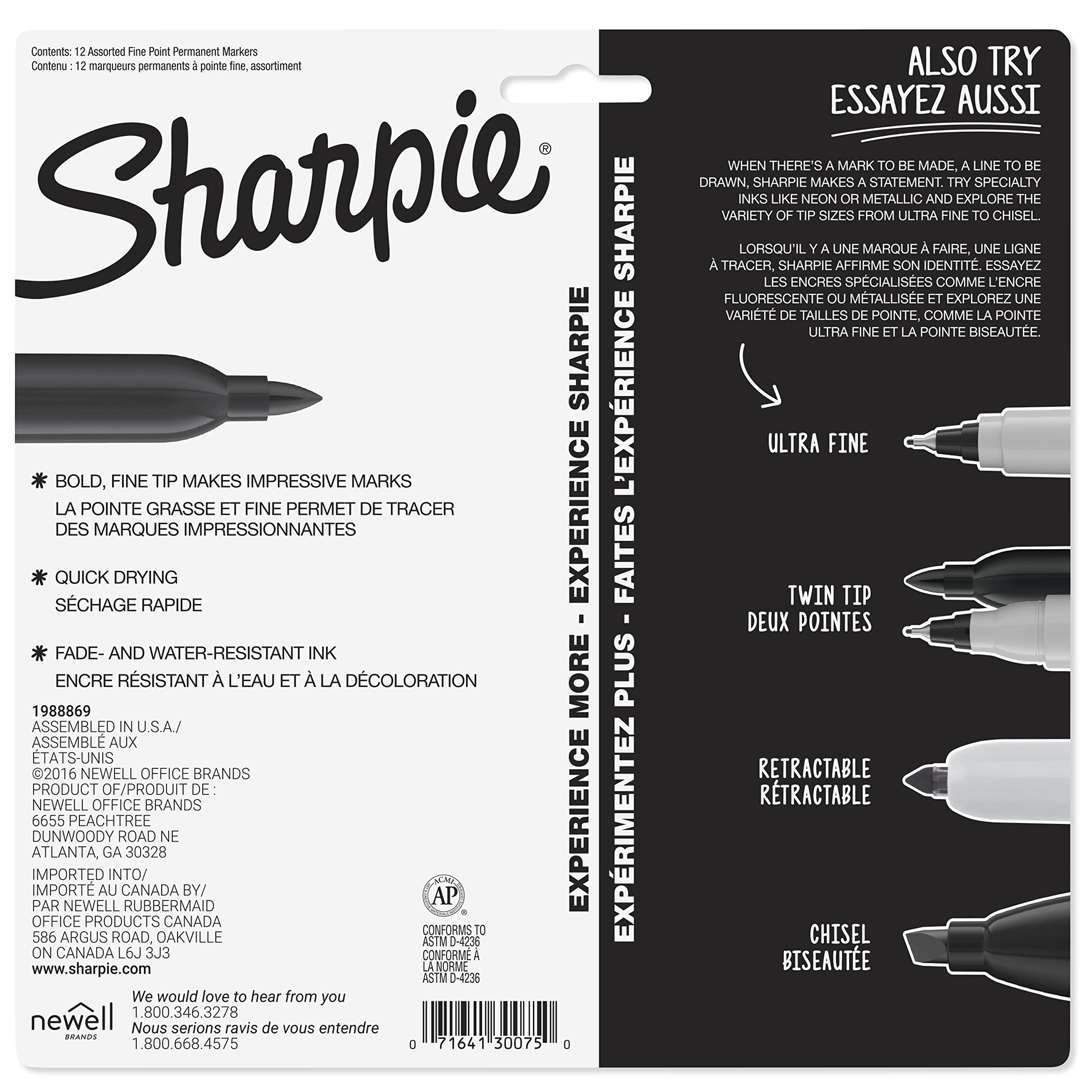 Details: Bold to the max and permanent to the core, Sharpie Permanent Markers inspire you to transform ordinary surfaces into passionately creative statements. Made to write practically everywhere, vivid Sharpie markers eliminate dull and boring. The original permanent marker, Sharpie has iconic ink that dries quickly and resists both water and fading. While pale imitations wither away, Sharpie markers make creations that endure. Featuring a bold fine point built for jaw-dropping marks, Sharpie Permanent Markers ignite courageous self-expression.