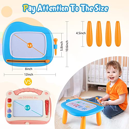 - đLarger Drawing Zones: Magnetic drawing board for toddlers 1-3 displays 4 colors (Red, Yellow, Blue, Green) that make childâs drawing more vivid. With 9.8″ screen doodle pad can be used repeatedly. One year old boys can easily pull the slide back and forth, then it will be clean again. Extend the life of the toy and let your child love it all the time. The design of the pen and the rope is integrated, no need to worry about the sudden loss of the pen, allowing children to draw more smoothly.