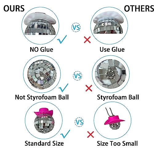 - DISCO BALL CAR ACCESSORY: This disco ball car mirror ornament is consisting of pink cowboy hat and disco mirror ball. When the sun hits the bling Glass ball car accessory, the interior of the car will sparkle, the light reflects in your car will makes you very happy, especially on the way to work.